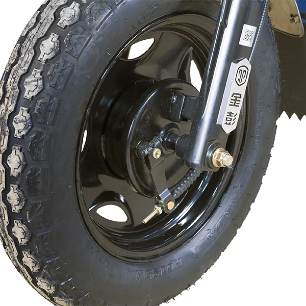 Этот электротрицикл оснащен гидравлическим приводом, что обеспечивает плавное и стабильное управление. Передняя подвеска состоит из усиленных гидравлических амортизаторов, которые обеспечивают комфортную езду даже на неровных поверхностях.