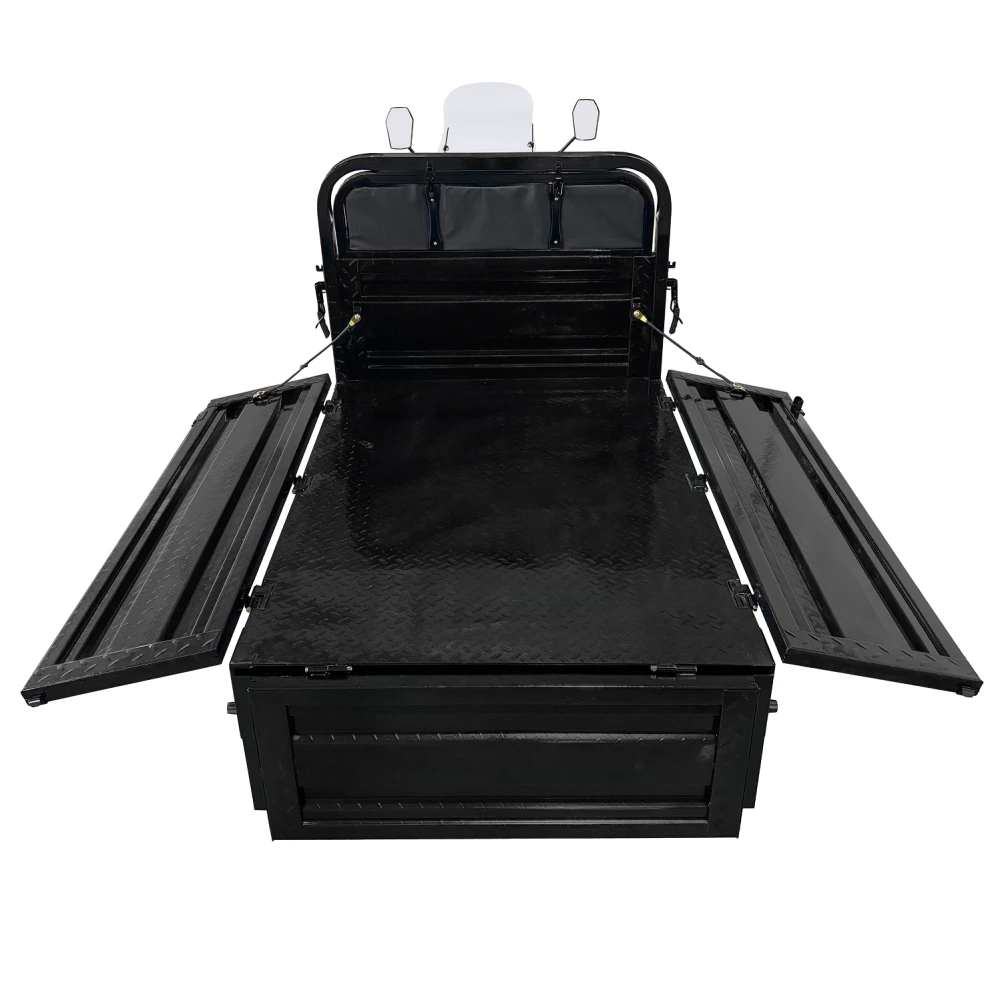 Ребристый усиленный металл, цельные борта на всю высоту кузова. Откидные задние и боковые борта на быстросъёмных петлях, насечки внутри кузова