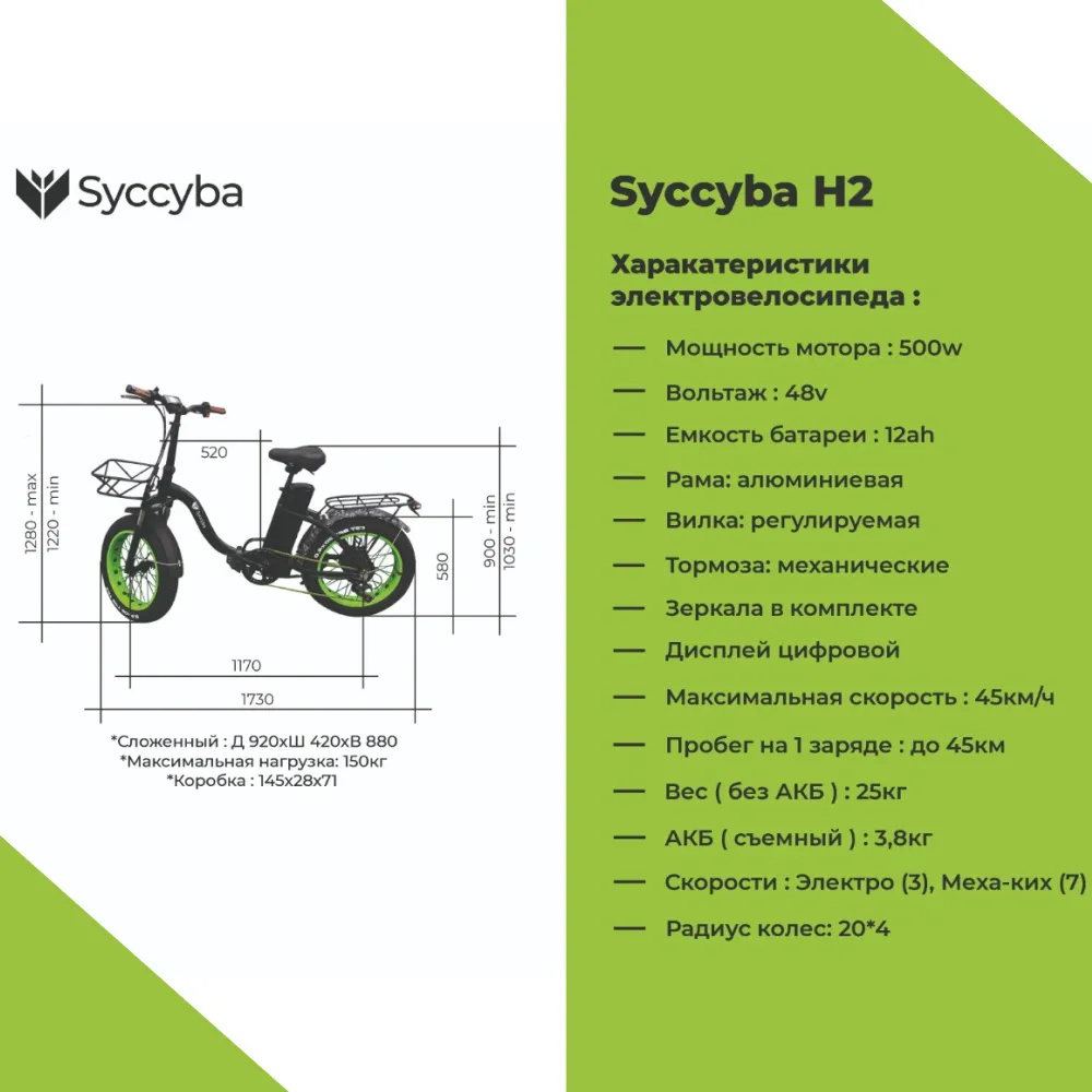 Фэтбайк Syccyba H2 – складной вариант электровелосипеда популярный и востребованный райдерами благодаря компактным эргономичным размерам, отличным скоростным характеристикам и маневренности. Модель легко управляемая и просто обслуживаемая. Оснащенность фирменными запчастями не вызывает проблем с эксплуатацией.